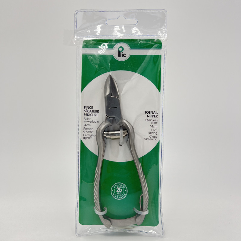 Pince sécateur pour manucure en acier inoxydable, longueur 14 cm, coloris vert. Ressort à lame pour une utilisation confortable et fermeture agrafe pour un rangement pratique. Garantie 25 ans.