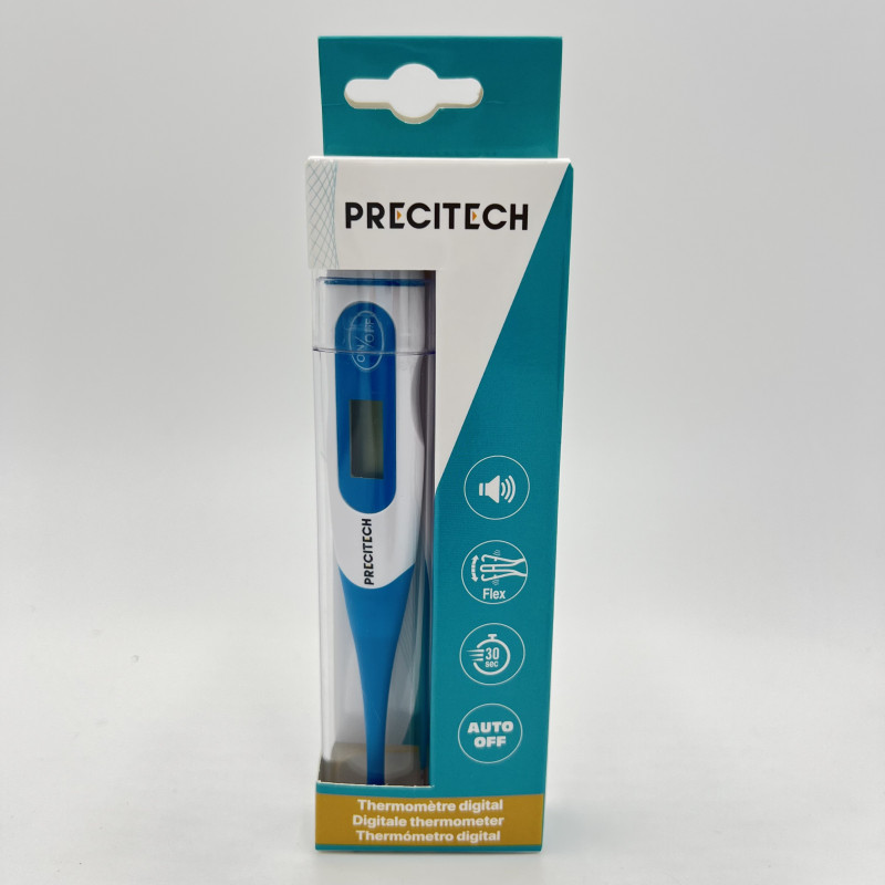 Le thermomètre digital Précitech assure une prise de température rapide, fiable et précise. Doté d’un embout rigide et d’un affichage digital clair, il convient à toute la famille. Sa couleur bleue le rend facilement identifiable. Simple d’utilisation, il s’éteint automatiquement après usage.