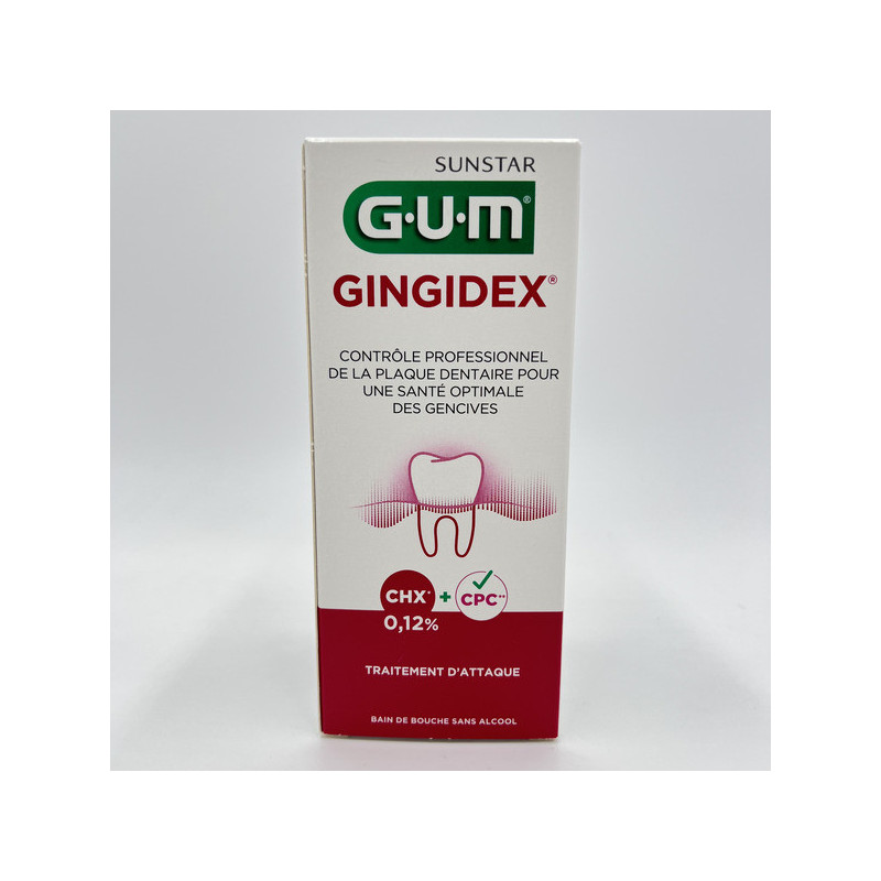 Le bain de bouche GUM Gingidex 0,12 % est spécialement conçu pour les personnes souffrant de gencives fragiles, irritées ou sujettes à l’inflammation. Sa formule contient de la chlorhexidine 0,12 %, un actif reconnu pour son efficacité antibactérienne, associée au CPC (chlorure de cétylpyridinium), afin d’aider à réduire la plaque dentaire et prévenir son accumulation.
