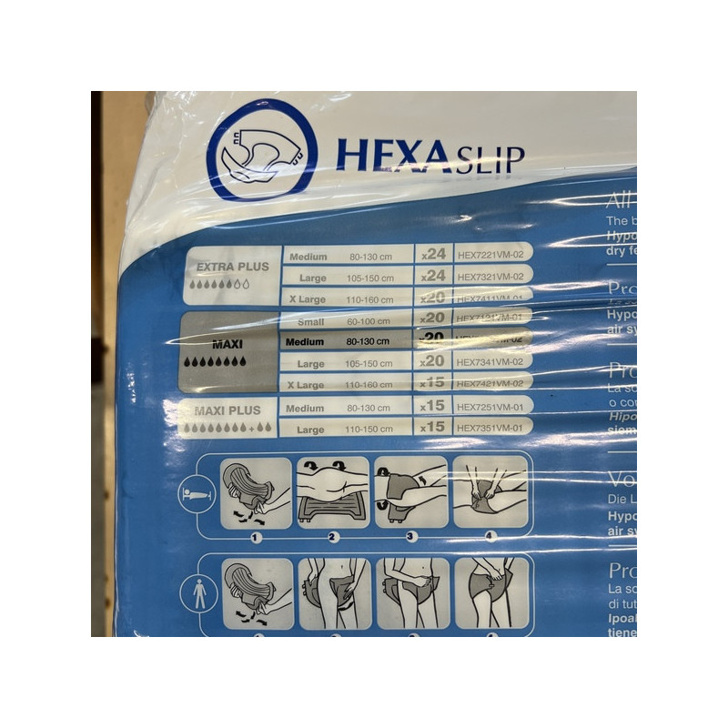 Les HEXA SLIP Taille M sont des protections anatomiques complètes destinées aux personnes présentant une incontinence modérée à sévère. Leur conception ergonomique avec attaches repositionnables garantit un excellent maintien, un ajustement précis et un confort optimal au quotidien.